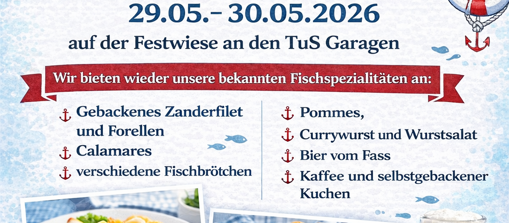 20. Fischerfest des TuS Gerolsheim 1892 e.V. – Ein Jubiläum mit Genuss und Geselligkeit Am letzten Juni-Wochenende ist es wieder so weit: Der TuS Gerolsheim 1892 e.V. lädt herzlich zum traditionellen Fischerfest ein – und das bereits zum 20. Mal! Gefeiert wird am Freitag, den 27. Juni ab 17 Uhr